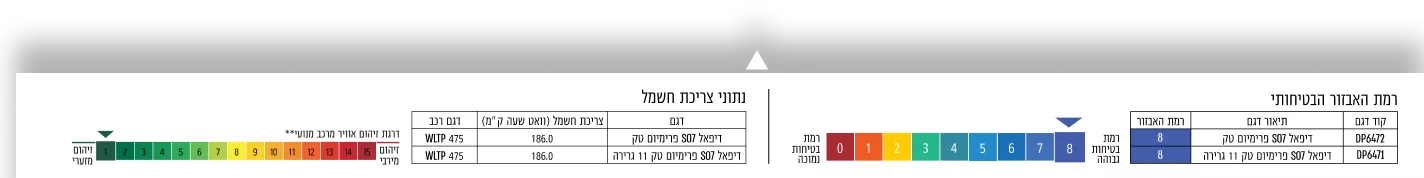 נתוני‭ ‬היצרן‭, ‬עפ‭"‬י‭ ‬בדיקת‭ ‬מעבדה. ‬תקן 2017/1151 (EU) על‭ ‬פי‭ ‬שיטת‭ ‬.WLTP‭ ‬יתכן‭ ‬פער‭ ‬בין‭ ‬צריכת‭ ‬החשמל‭ ‬בתנאי‭ ‬מעבדה‭ ‬לבין‭ ‬צריכת‭ ‬החשמל‭ ‬בפועל. ‬ ‭‬**הדרגה‭ ‬מחושבת‭ ‬לפי‭ ‬תקנות‭ ‬אוויר‭ ‬נקי (‬גילוי‭ ‬נתוני‭ ‬זיהום‭ ‬אוויר‭ ‬מרכב‭ ‬מנועי‭ ‬בפרסומת)‭,‬ התשס‭"‬ט ‭ 2009